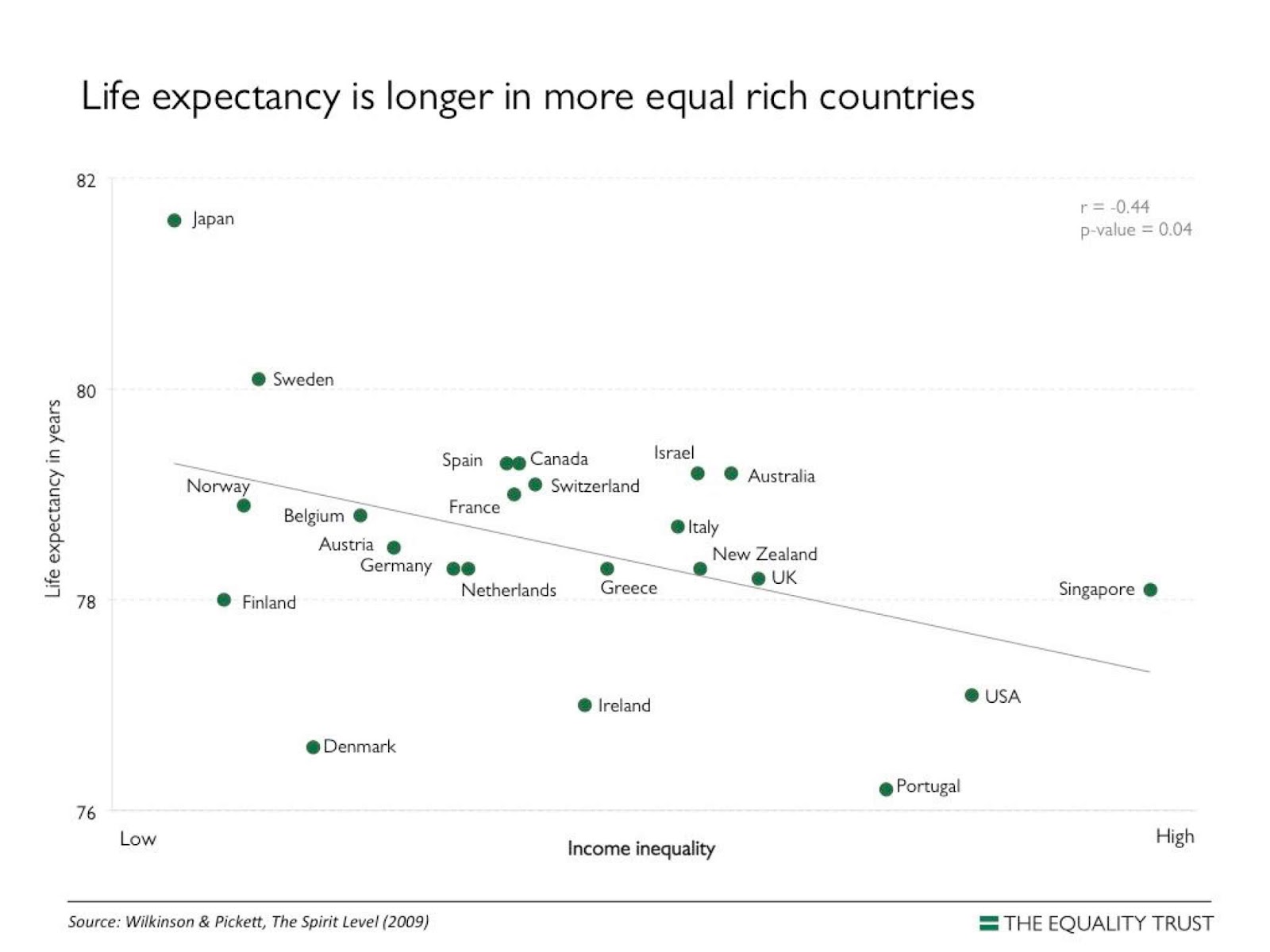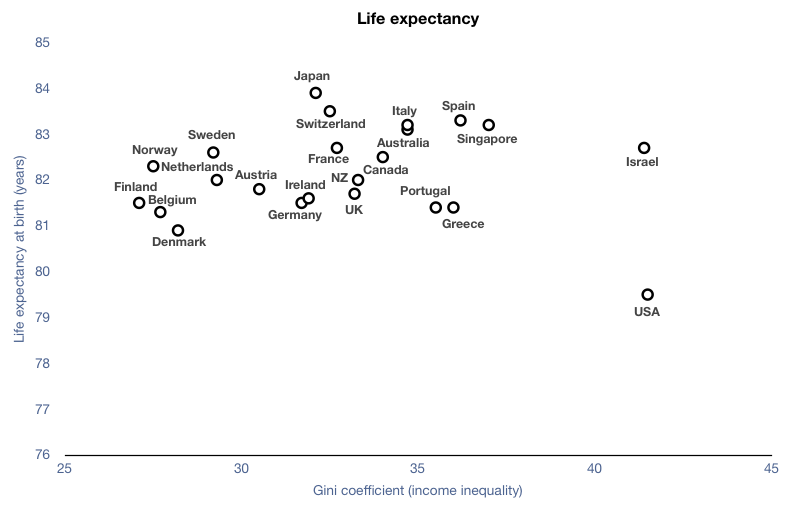 Here, for example, is a key graph from The Spirit Level on inequality and life-expectancy.