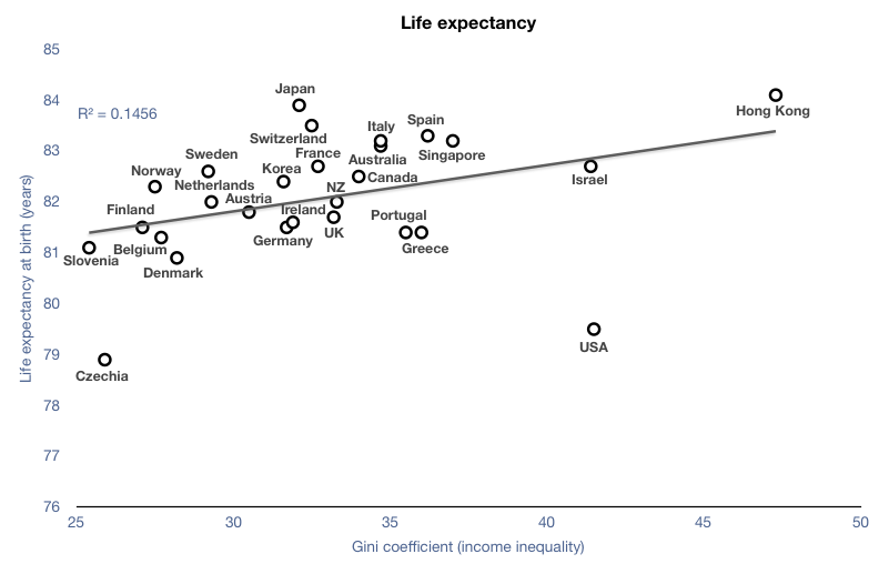 If we add the four countries that are unequivocally richer than Portugal and were excluded from The Spirit Level for no good reason (South Korea, Hong Kong, Slovenia and the Czech Republic (now known as Czechia)), there is a statistically significant association with inequality but it is in the opposite direction to that predicted by The Spirit Level hypothesis, with greater inequality correlating with longer life expectancy (r2=0.145, R=0.385, p-value=0.0495).