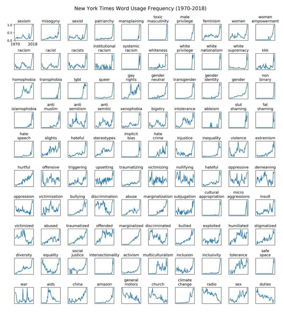 Many trends develop over decades but I’ve never seen change so rapid as the breathtaking success of what one might call social justice concerns. Beginning around 2010-2014 there appears to have been a inflection point. Here from Zach Goldberg on twitter are various words drawn from Lexis-Nexis.