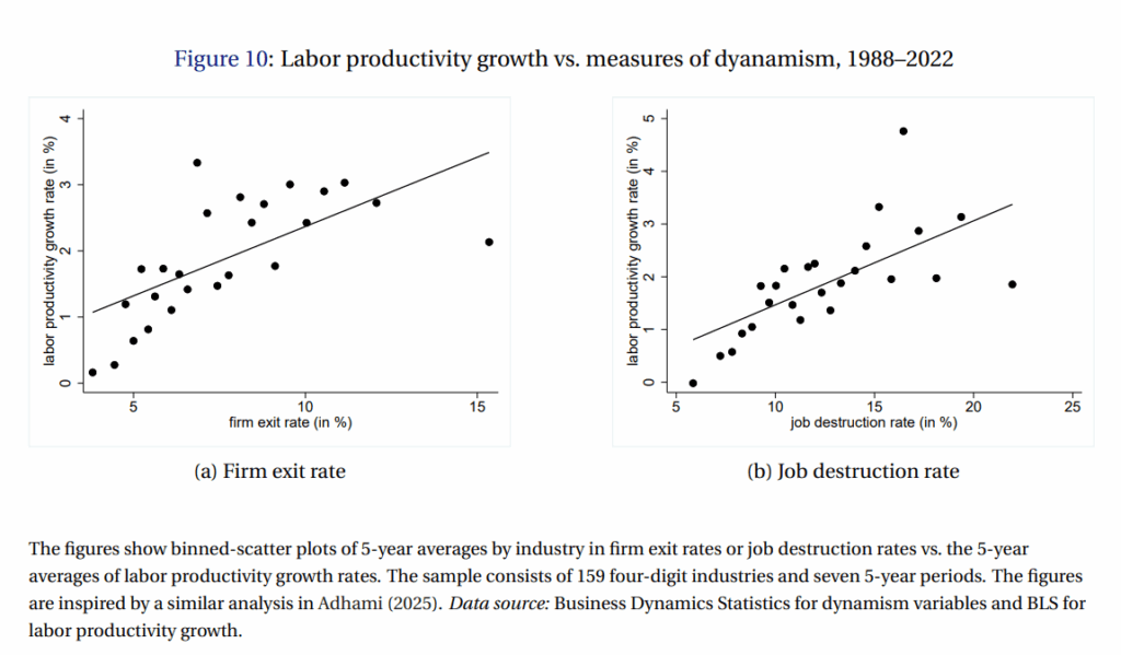 A good figure from the Nobel Prize Foundation’s Scientific Background to the Mokyr, Aghion and Howitt Nobel. The figure shows that firm exit rates and job destruction rates are positively correlated with growth in labor productivity; creative destruction in a nutshell.